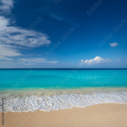 Fototapeta premium 美しいビーチが広がり、透き通った青い海が穏やかに波打っています。背景には青い空と白い雲が広がり、平和でリラックスした雰囲気が漂っています。晴天の下で自然の...