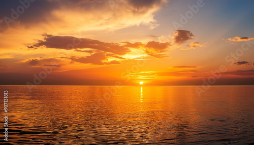 Naklejka premium 夕焼けの美しい海の景色を描いています。空はオレンジ色からピンク色に染まり、太陽が水平線に沈む瞬間が捉えられています。雲はドラマチックな形をしており、光の反射が水面に映り込んでいます。穏やかな海の広がりが、静かな時間の流れを感じさせます。generative AI