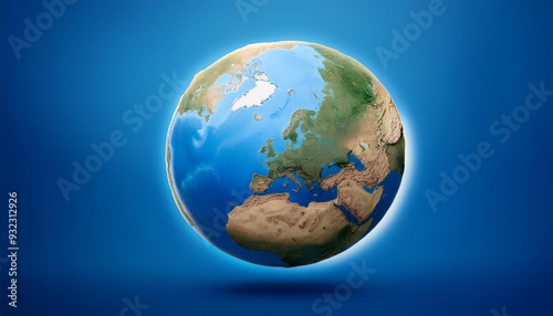 Fototapeta premium 青い背景に浮かぶ地球が描かれています。地球はヨーロッパと北アフリカ、アジア西部を中心に表示されており、陸地の地形や海洋の青が鮮明に表現されています。地球の...