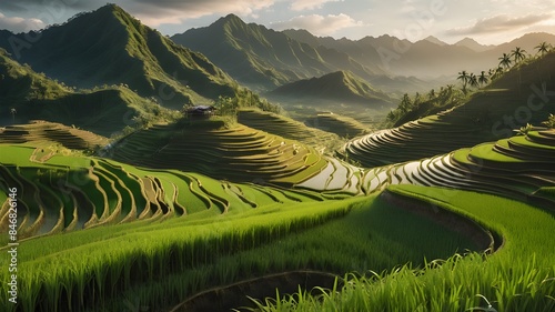 © Riki, Fototapeta premium Generative AI. Admiring the intricate beauty of rice terraces carved into the mountains