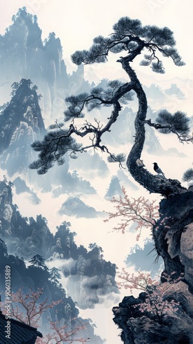 © beeboys, Fototapeta premium 松の木と山の水墨画,Generative AI AI画像