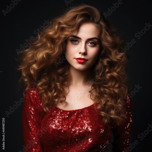 © Julia Zarubina, Fototapeta premium Generative AI, beautiful European curly brunette girl in a red shiny evening dress on a dark background, happy new year, christmas, celebration, party, elegant woman, amazing lady