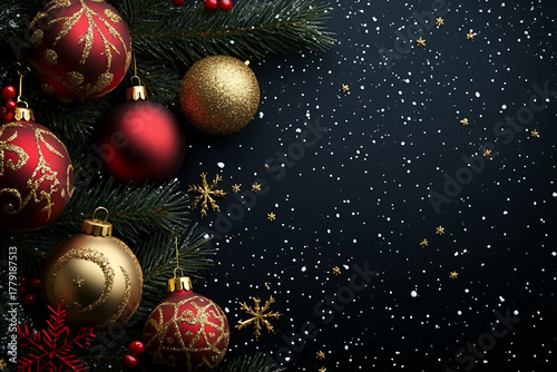 © Tetiana, Naklejka premium Generative AI Christmas background with festive wreath, pine branches, baubles, cones and space for holiday greeting or text