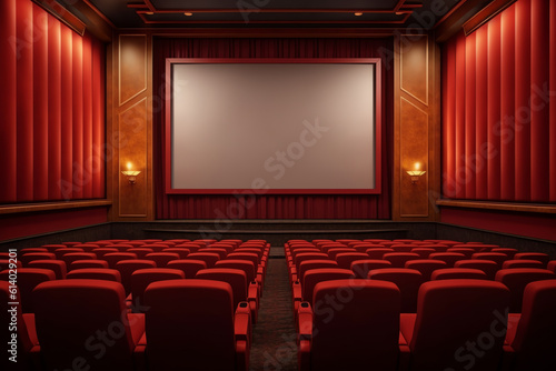 © Generative AI, Obraz premium Generative AI Cinema auditorium with screen and red seats. Vector.