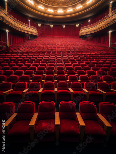 © Generative AI, Naklejka premium Generative AI Classic rows of empty reddish seats in theatre. Hall without visitors. Shallow depth of field