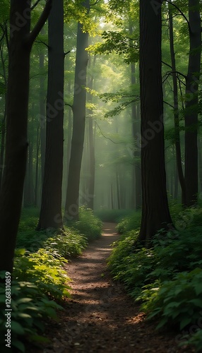 © Halim, Obraz premium Generative AI Forest Trail with Sun Rays Streaming Through the Canopy