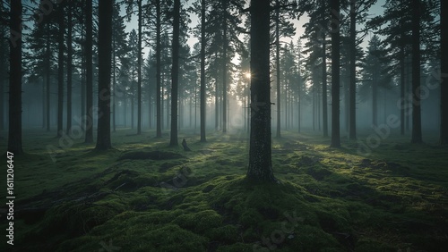 © Creative Array, Obraz premium Generative AI Golden Sunset on Snowy Winter Forest Scene