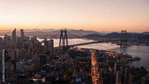 Obraz premium Generative AI, Golden Sunset Over a City and Suspension Bridge