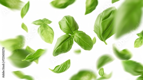 © The Little Hut, Fototapeta premium Generative AI : Green basil leaves flying on white background. Fresh levitating leaves isolate
