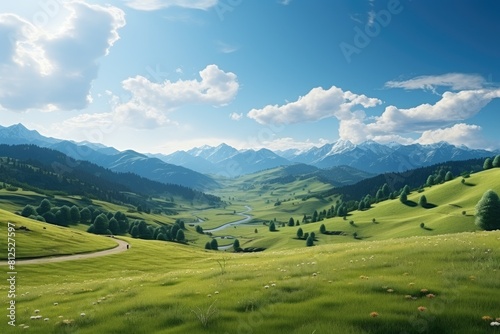 Obraz premium Generative AI. Idyllic Summer Landscape with Lush Green Meadows and Distant Mountains.