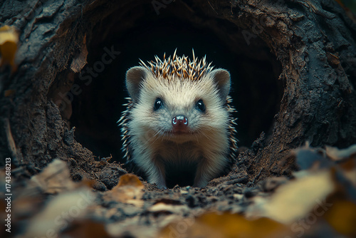 © Tetiana, Naklejka premium Generative AI image of a cute hedgehog waking up in forest leaf nest after hibernation in early spring sunlight