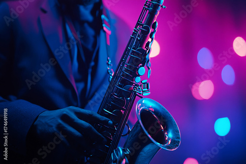 © Tetiana, Fototapeta premium Generative AI Image of a Jazz Performer Playing a Saxophone in a Vibrant Atmosphere