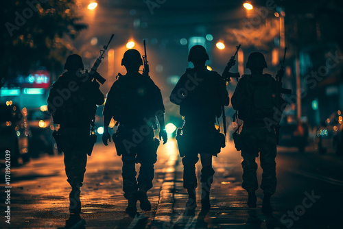 © Tetiana, Naklejka premium Generative AI Image of Armed Terrorist Gang Engaged in Dangerous Combat with Rifles
