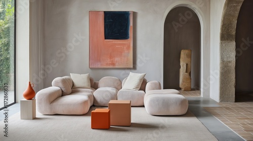 © 형근 최, Fototapeta premium Generative AI, Minimalist living room with a blush modular sofa and bold orange accents