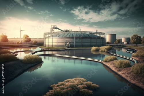 Fototapeta premium Generative AI of a large industrial building with a pond in the foreground
