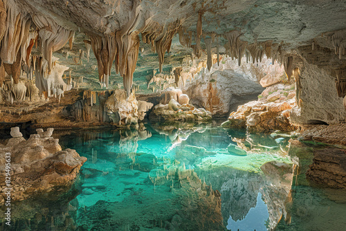 © Olegarx525, Fototapeta premium Generative ai on theme of a large beautiful sharp stalactites hanging down from deep mountain cave
