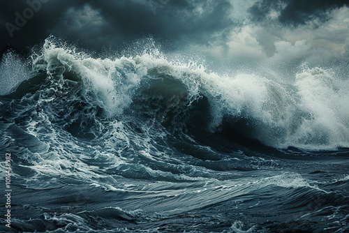 © Olegarx525, Fototapeta premium Generative ai on theme of a scary tsunami with huge foamy wave, apocalyptic dramatic background
