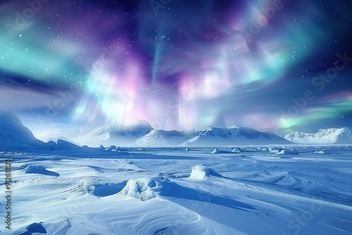 © Olegarx525, Naklejka premium Generative ai on theme of beautiful northern lights, bright aurora borealis winter in atmosphere