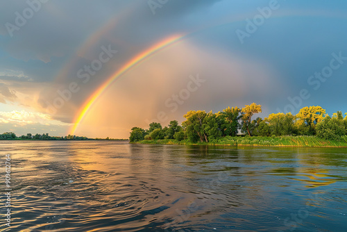 © Olegarx525, Naklejka premium Generative ai on theme of beautiful tranquil landscape with magical bright rainbow at cloudy sky