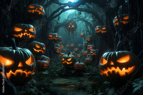 © Olegarx525, Fototapeta premium Generative ai on theme of large scary pumpkin with cut out eyes for celebration holiday Halloween