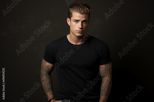 © Tetiana, Naklejka premium Generative ai photo image of a confident man with tattooed hands isolated on grey color background