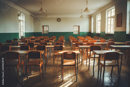© Tetiana, Obraz premium Generative ai picture collage of classroom interior with school desks chair for different lecture seminar