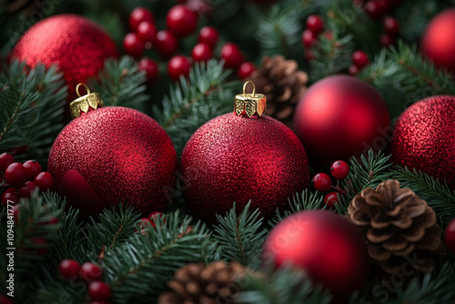 © Tetiana, Fototapeta premium Generative AI picture photo of festive Christmas decor baubles berries pinecones decorations for holiday shopping decoration