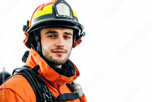© Tetiana, Fototapeta premium Generative AI Portrait of a Young Emotional Firefighter in Uniform Against White Background