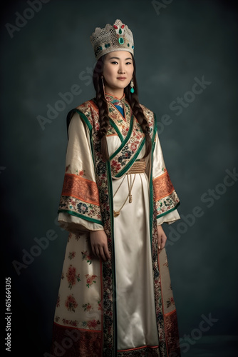 Fototapeta premium Generative ai portrait of beautiful asian kazakh mongolian chinese woman in national costume