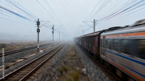 Fototapeta premium Generative AI train journey through misty landscapes