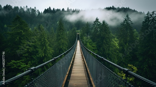 Fototapeta premium Generative AI, treetop boarding bridge on misty fir forest beautiful...