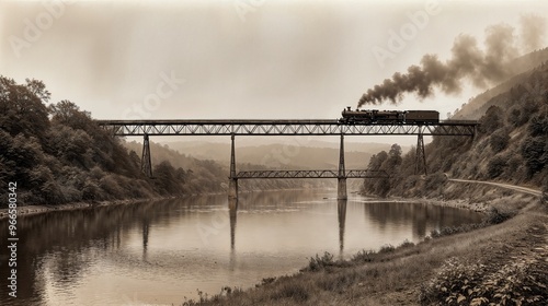 Fototapeta premium generative ai, Vintage Steam Train Crossing a Bridge Over a Calm River in a...