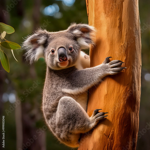 © Wittke Photography, Obraz premium Generative artificial intelligence (AI) image of an Australian Koala climbing up a Eucalyptus tree in a forest.