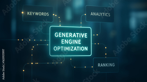 © AiDesign, Obraz premium Generative engine optimization with glowing digital connections linking keywords, analytics and ranking on dark background, concept of search marketing, online visibility and data driven content