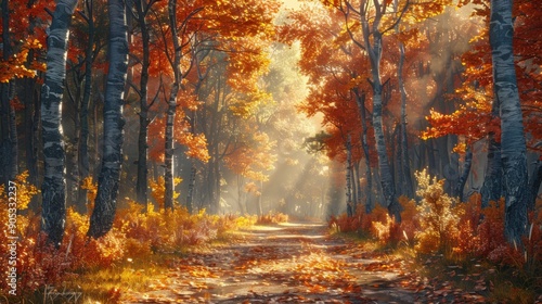 Fototapeta premium Generative image of a forest path in fall with yellow fallen leaves and soft rays of sunlight.