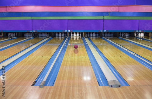 © Brocreative, Naklejka premium Generic Bowling Alley lanes with bowling ball going towards the pins