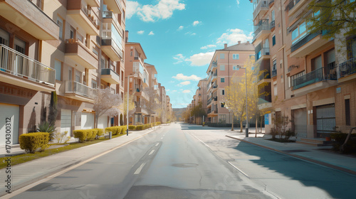 Obraz premium Generic stock image of a residential urban street with apartment buildings, balconies, asphalt road and sidewalks, created for real estate and housing use in southern Europe. Not a specific location.