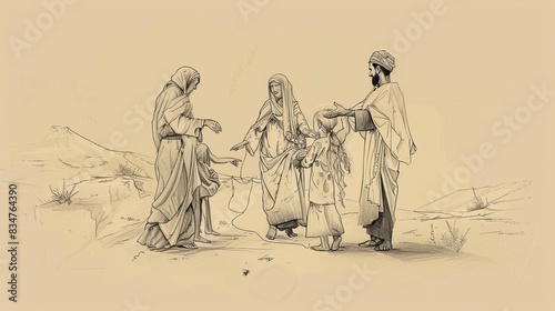 Fototapeta premium Genesis 21 Biblical Illustration: Birth of Isaac, Hagar and Ishmael Sent Away, God's Promise - Beige Background with Copyspace for Inspirational Use