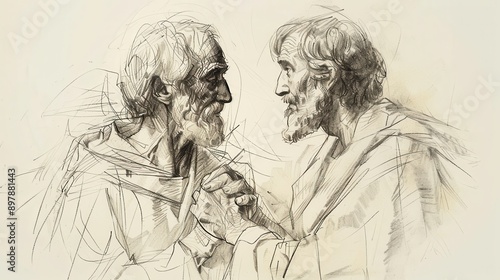 © T Studio, Obraz premium Genesis,God Blesses Jacob:Minimalist Sketch of God Reaffirming His Promise to Jacob, Bold Pencil Lines, Soft Beige Background Biblical Illustration