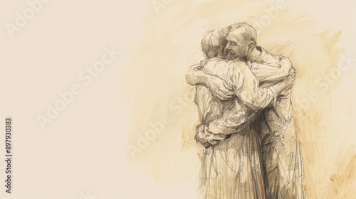 Fototapeta premium Genesis,Jacob Blesses Ephraim and Manasseh:Scene of Jacob Hugging Ephraim and Manasseh, Bold Pencil Sketch, Minimalist Modern Biblical Illustration, Soft Beige Background