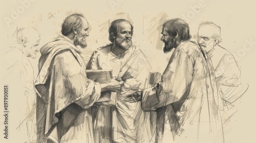 © T Studio, Fototapeta premium Genesis,The Second Journey to Egypt:Modern Bible Wall Art of Brothers Presenting Gifts to Joseph, Bold Pencil Sketch, Minimalist Design, Soft Beige Background Biblical Illustration