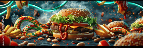 © btiger, Naklejka premium Genetic Impact of Fast Food on Health: DNA Influence on Eating Habits with Photorealistic Junk Food Background