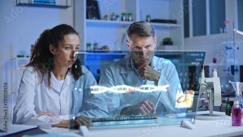 Obraz premium Genetic lab workers puzzled with experiment results, looking at screen, DNA...