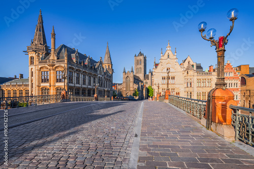 Naklejka premium Gent, Belgium, Saint Michael Bridge, River Leie, historical Flanders.