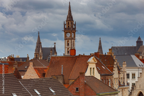 © pillerss, Fototapeta premium Gent. Clock tower at sunset.