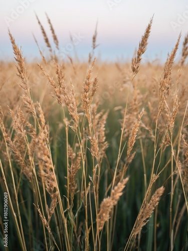 Obraz premium Gentle breeze moving tall golden grass under evening light