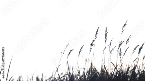 © Namwan, Obraz premium Gentle breeze swaying tall grass, serene landscape with soft light, ideal for nature themes and calming backgrounds. Isolated on white background or PNG