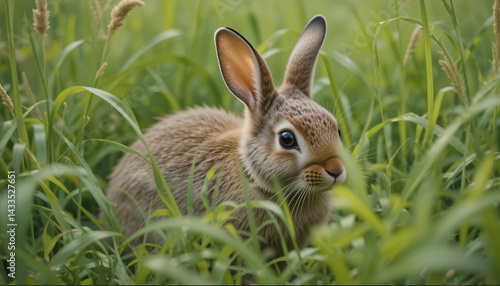 Fototapeta premium Gentle Bunny in the Green: A curious bunny nestled in a lush, vibrant green meadow, its attentive gaze capturing the serene essence of the outdoors.