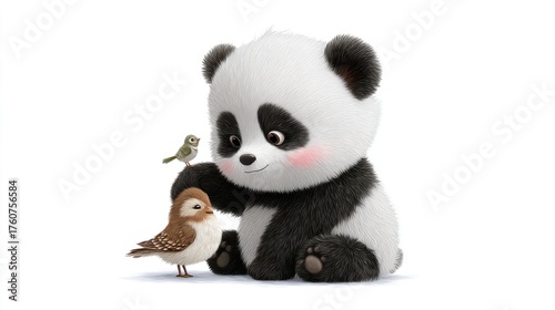 Naklejka premium Gentle cartoon panda patting small baby bird on the head, warm expression,...