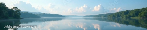 © beng, Fototapeta premium Gentle clouds drift across a serene lake surface, reflection, , trees
